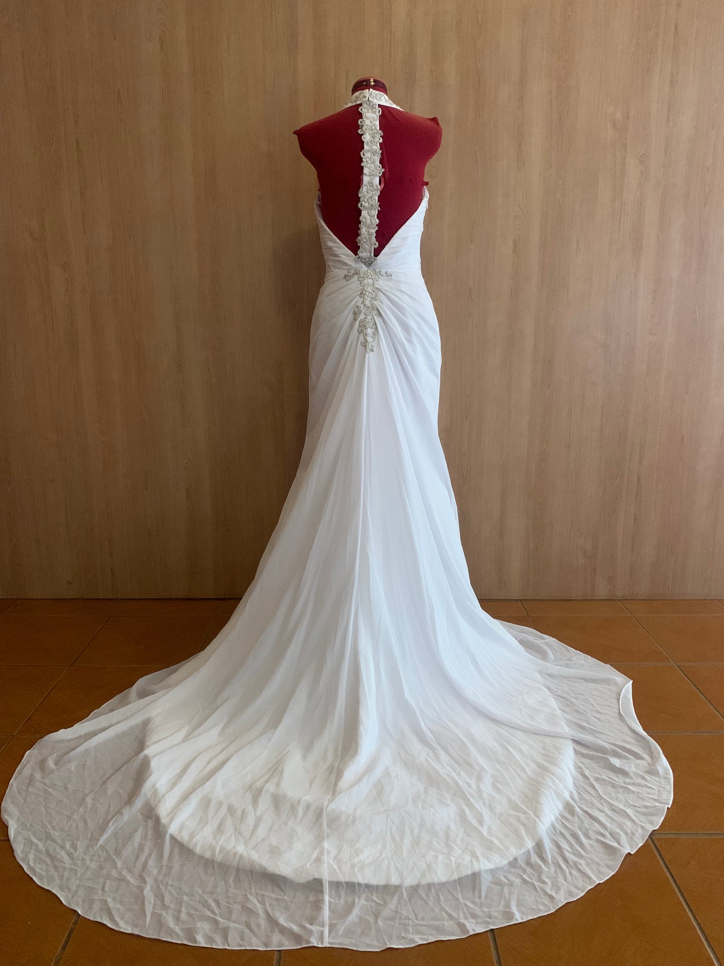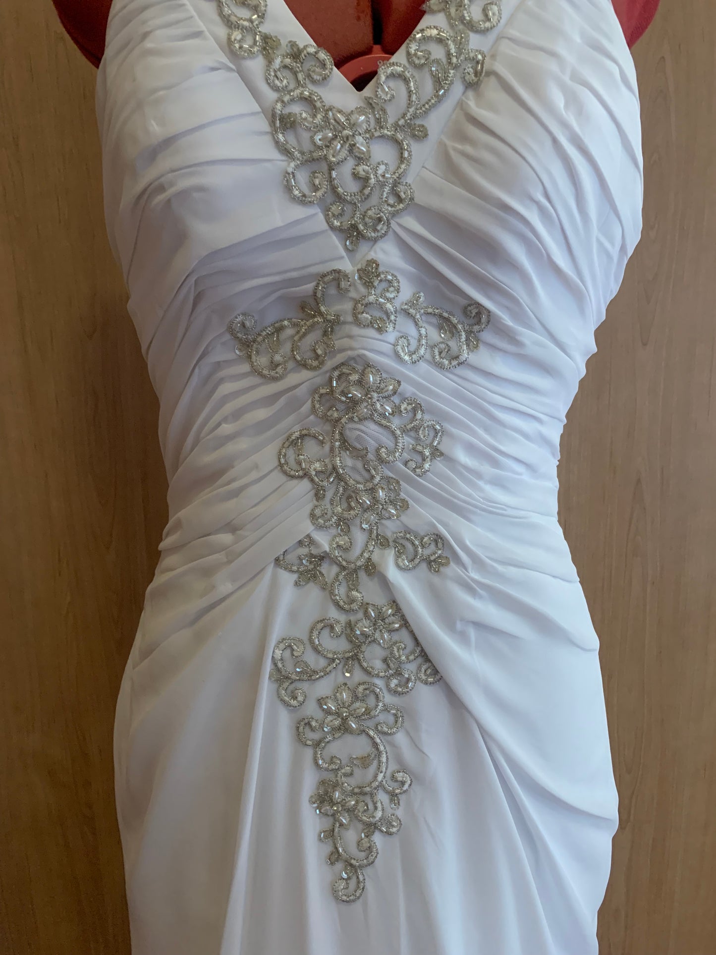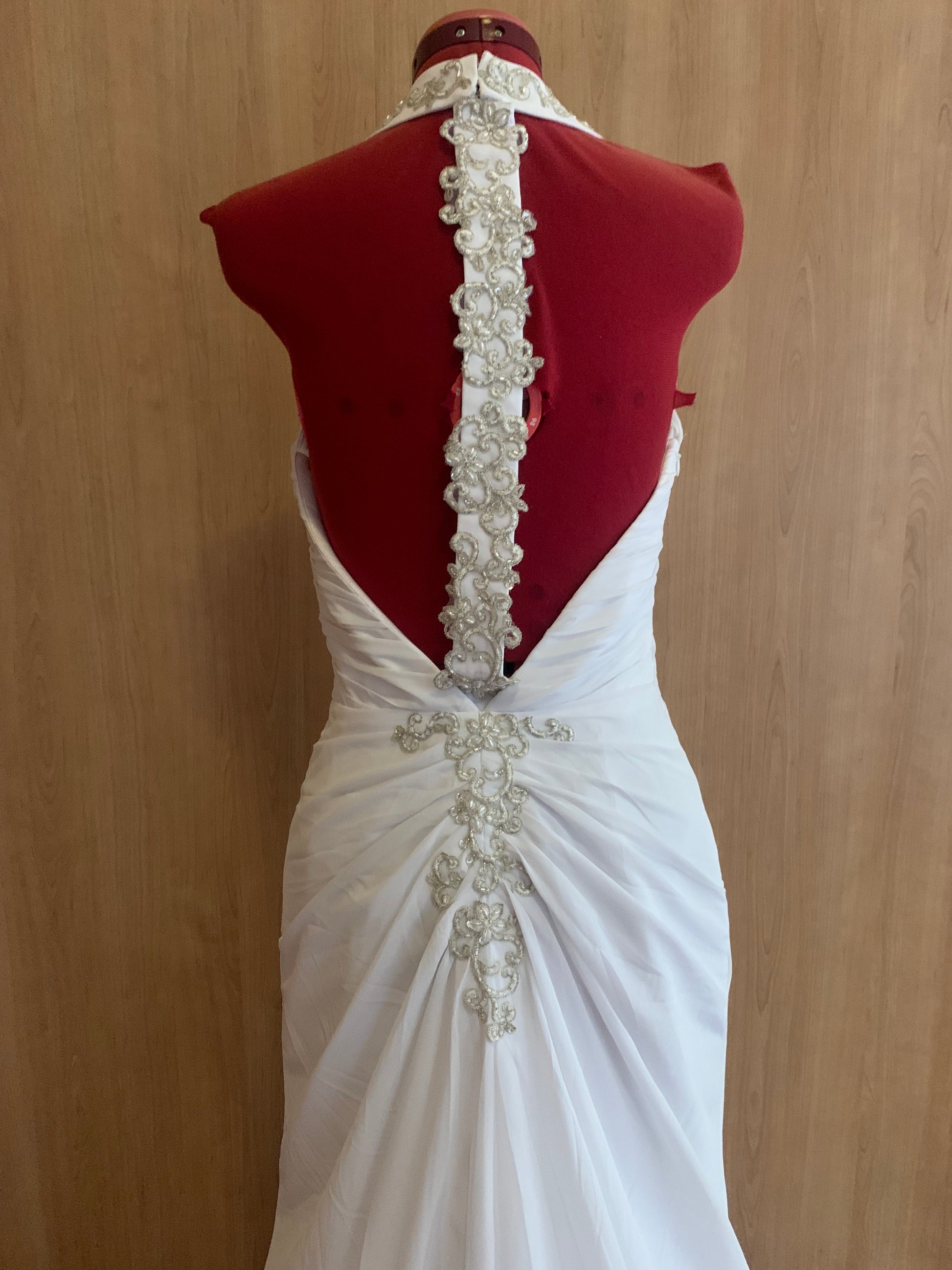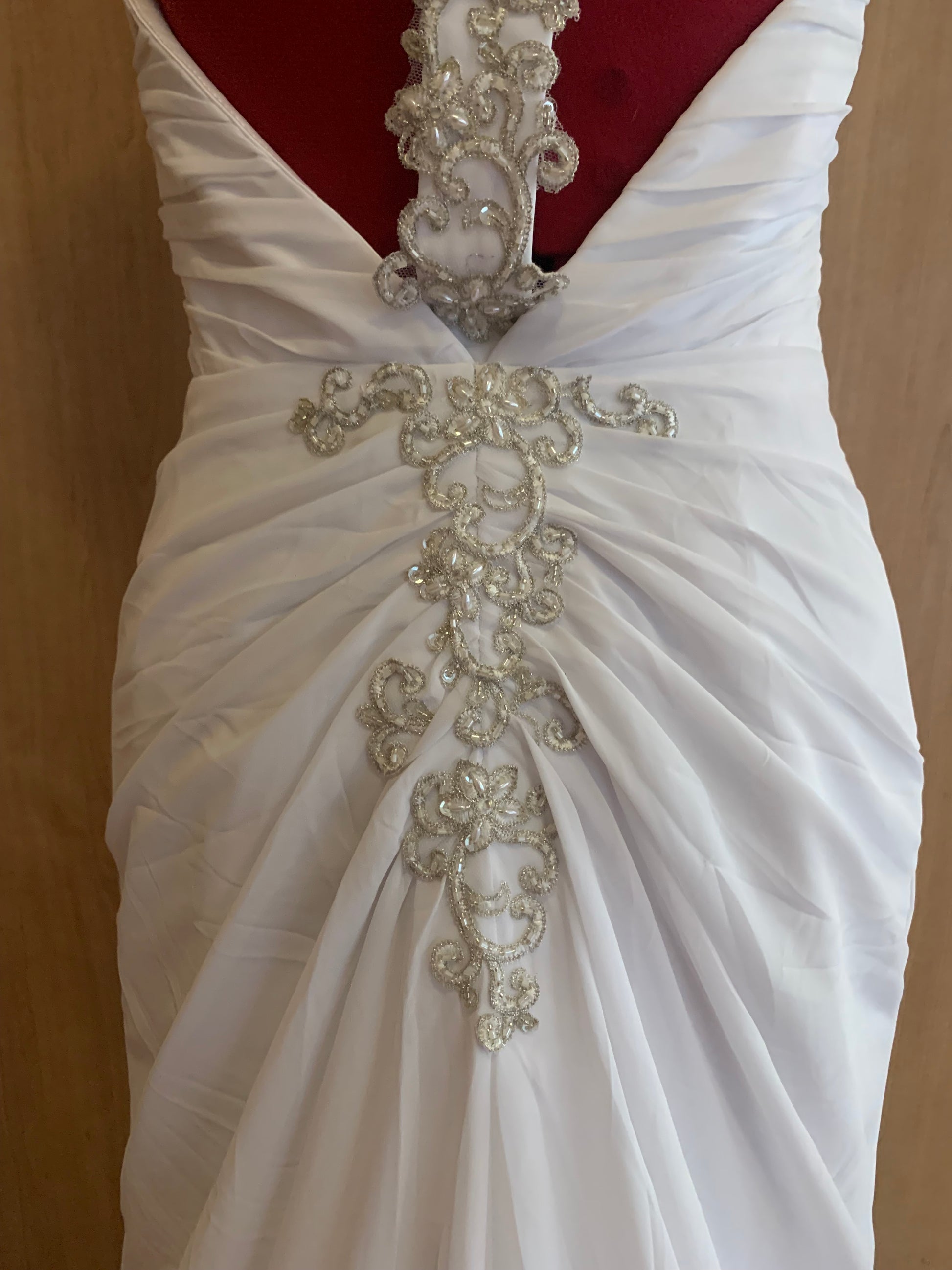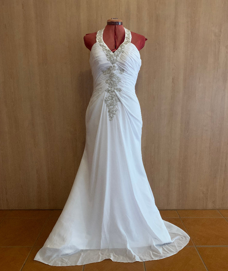 This Ariel fit and flare wedding dress is an elegant choice for your big day. The intricate beading adds a touch of glamour, while the open back and ruching create a figure-flattering silhouette. Perfect for a beach inspired wedding, this dress will make you feel radiant and confident as you walk down the aisle.